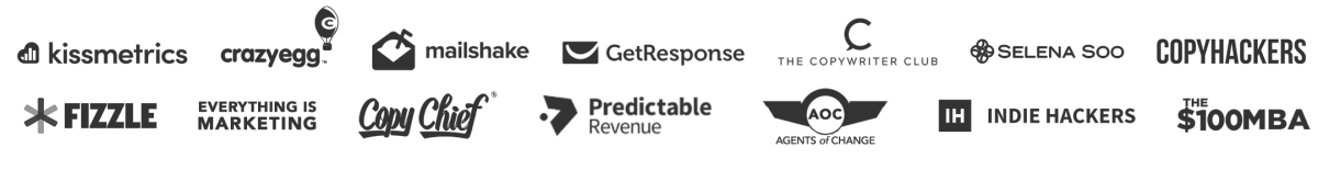 Also: I've been featured on highly-ranked outlets like Copyhackers' blog, The Fizzle Show, Copy Chief Radio, CrazyEgg, and Unbounce, and have spoken at conferences like MicroConf and Shine Bootcamp.